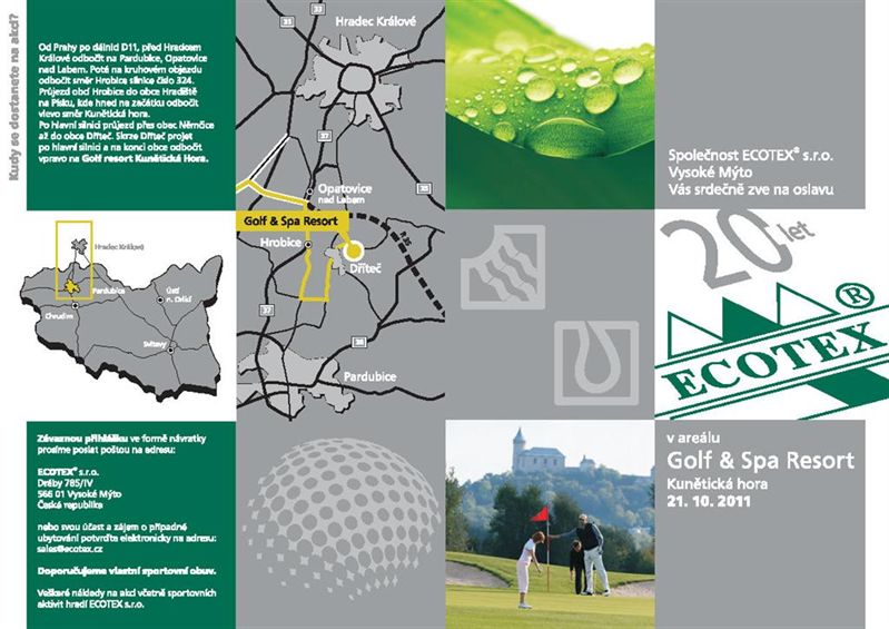 On 21st October 2011 a spectacular celebration ofthe 20th anniversary of the company ECOTEX was held with the participation of VIP customers from the Czech Republic as well as abroad. The meeting took place at the Golf & Spa Resort of Kunětická Hora. The program included a golf academy, a golf course tour and a possibility to use facilities of the local wellness centre. In the evening hours a ceremony took place and the finale of the program was an unveiling of the new ECOTEX company logo.